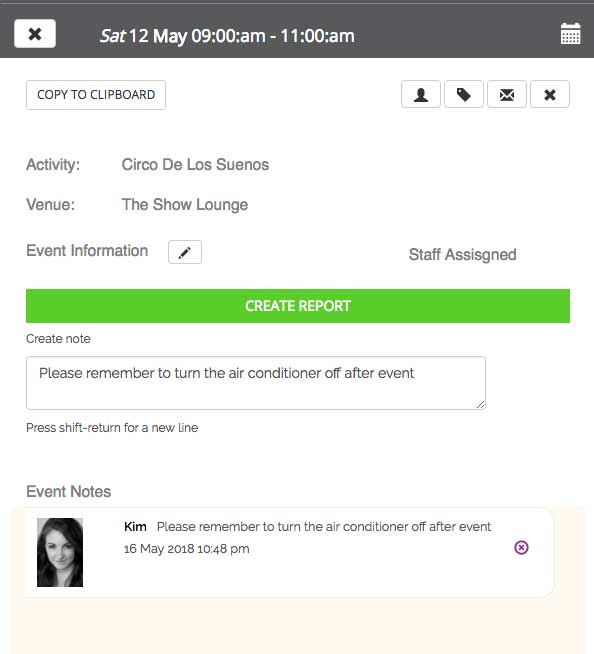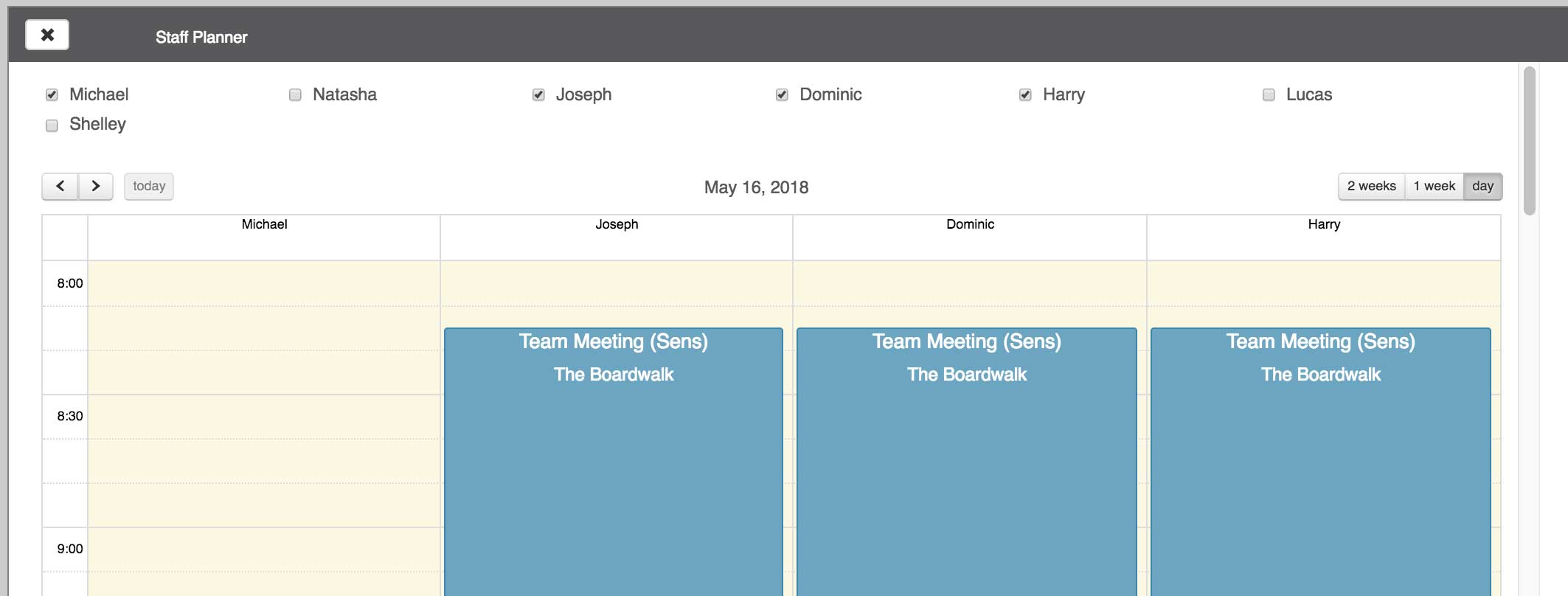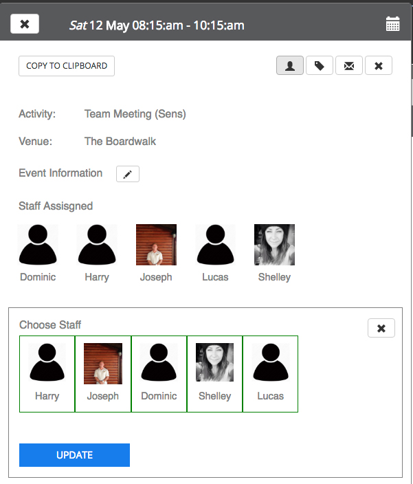 To assign staff to an event click on the staff icon from the event popup window. Click on each staff member to add or remove them from the event, and click UPDATE when finished.
