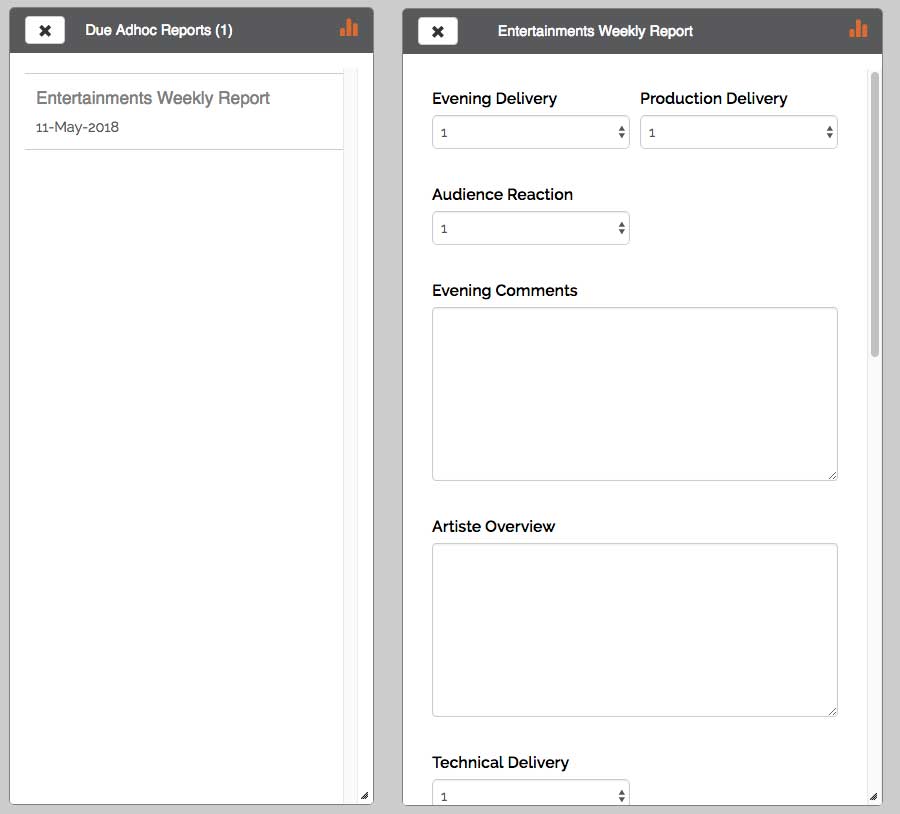 Artiste reports can be submitted by either selecting an event from the Artistes Due Reports module, artiste event from the Visiting Artistes Planner or Resort Planner. If a report is due, then you will see the Create Report button which will display the artiste feedback report form to be completed.