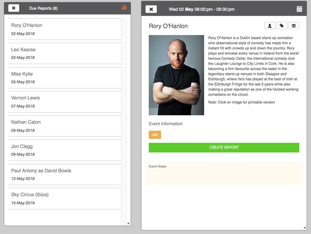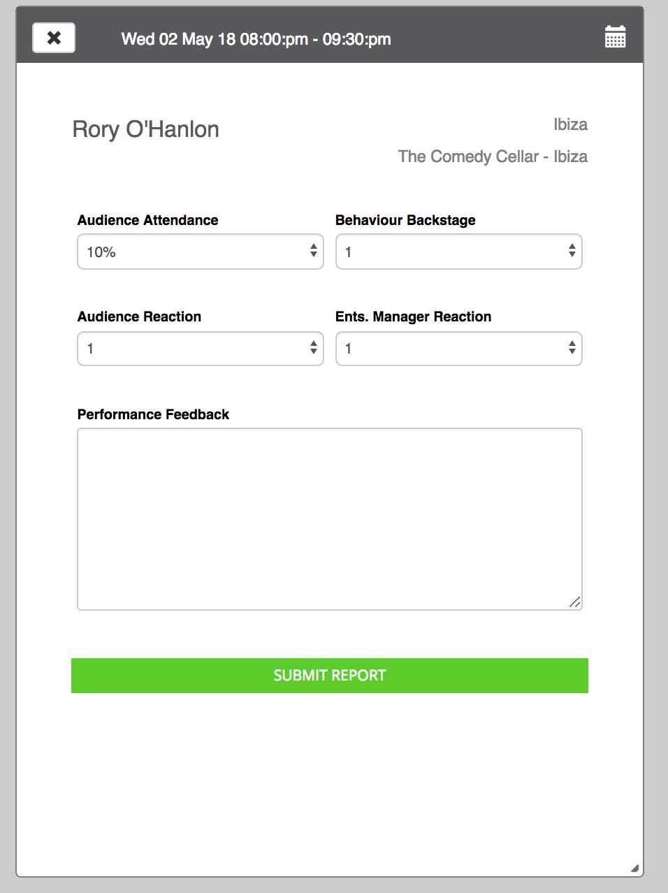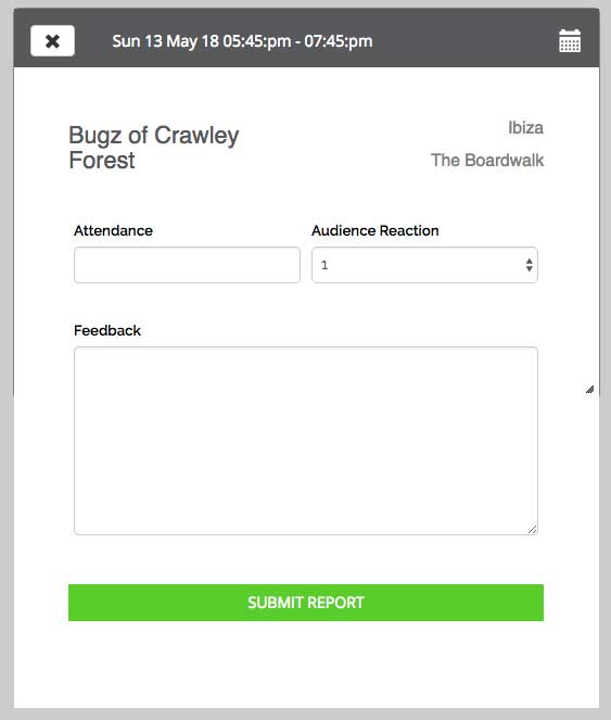 If for any reason the artiste does not match the actual artiste performing then please don't complete the report, but contact tedAgency and they will change to the correct artiste or remove from your bookings.