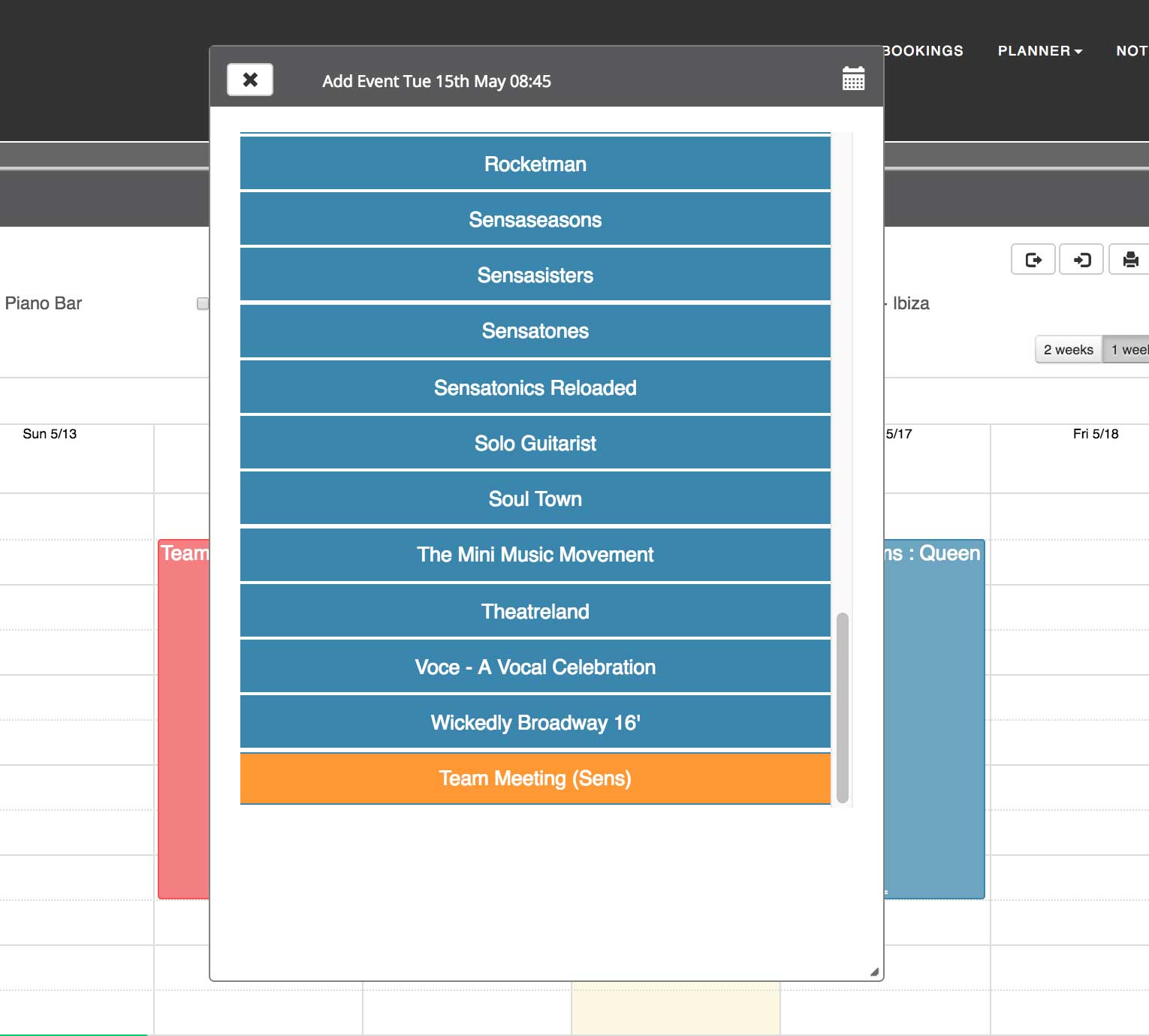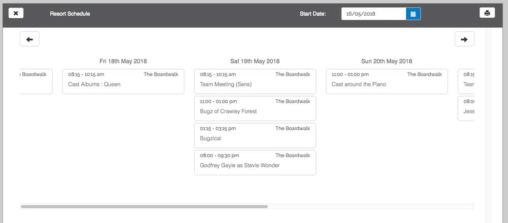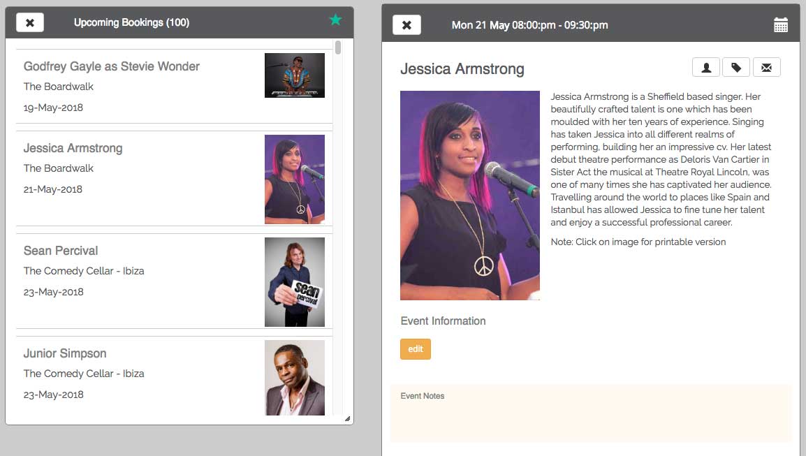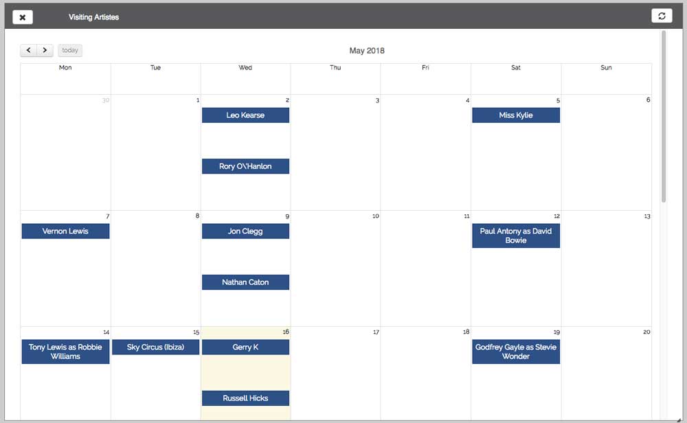 The Bookings module shows your upcoming resort visiting and local artists events. Selecting a booking will show the artiste details and clicking on their image will display this in a seperate browser tab for use on resort.