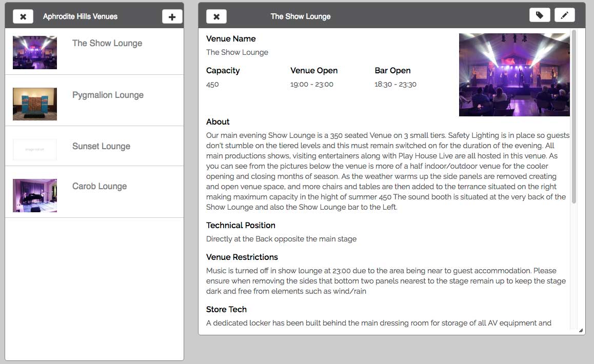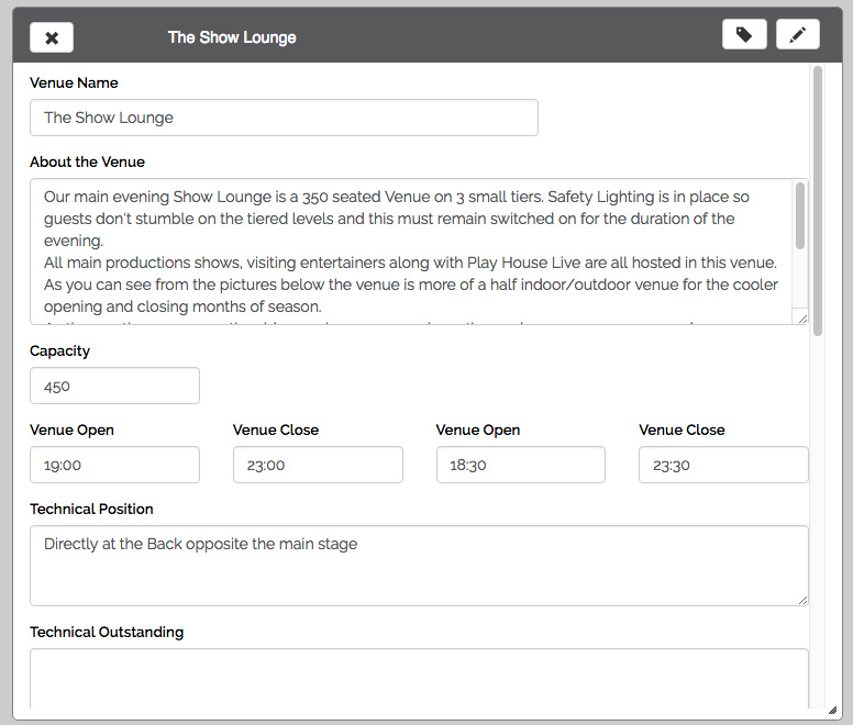 The venues module alows you to manage your local resort venues to seen within the resort planner. Here you can see and modify specfic venue information that is useful to tedAgency and for handover to another ent manager