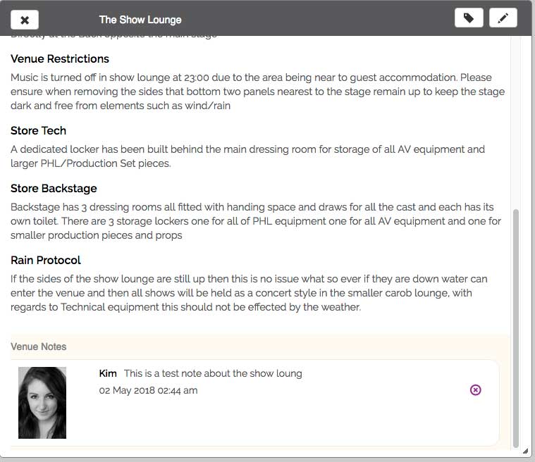 Click the icon to add a new venue or select the venue to view and click the icon to edit that venue. You can also create notes for a venue by clicking the icon.